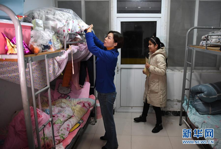 11月25日,芜湖市盲人学校校长席蔚菁晚上巡查学生宿舍时帮学生整理物品。新华社记者 刘军喜 摄