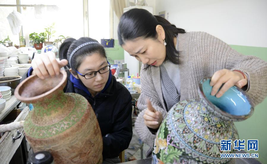 12月2日,景泰蓝技艺国家二级点蓝技师聋哑人赵楠(右)在用手语指导她的徒弟刘鸣燕昊。