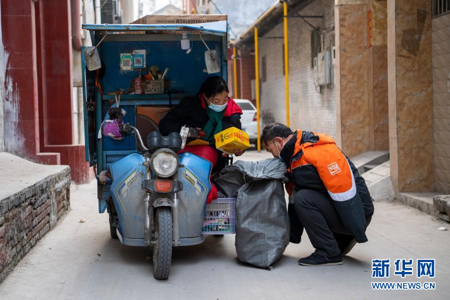 12月1日,在运城市盐湖区红旗西街,赵海峰和妻子杨芬艳查看快件信息。新华社记者 杨晨光 摄