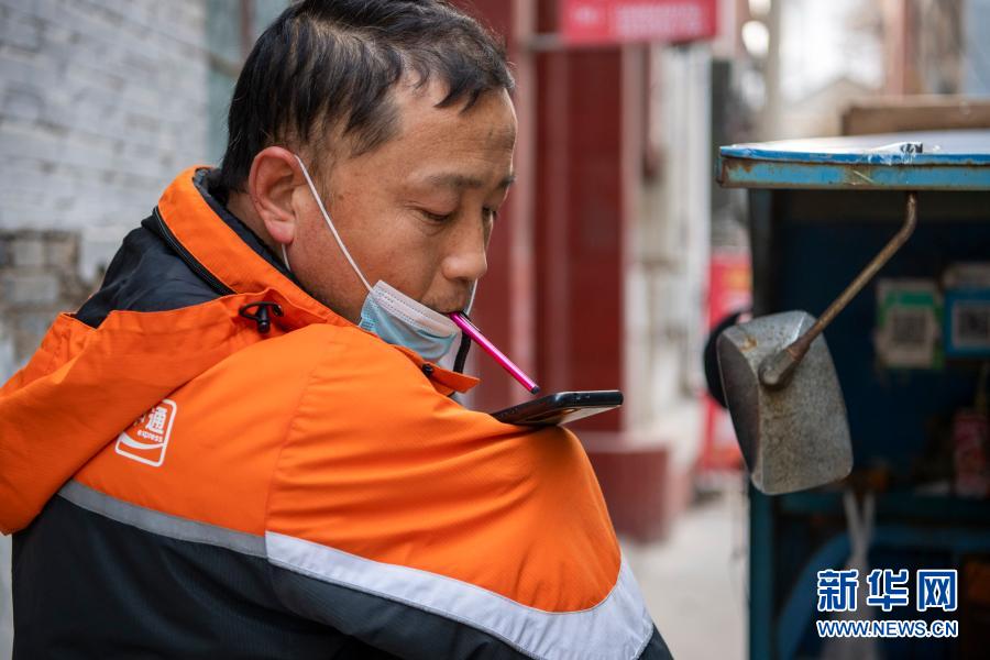 12月1日,在运城市盐湖区红旗西街,赵海峰通过手机确认信息。新华社记者 杨晨光 摄