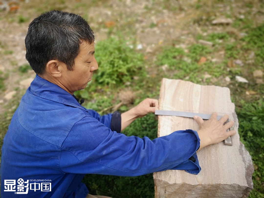正式凿石磨前,需要去山上取料,根据经验从露出一个头的蛛丝马迹中找到想要的石材,把它挖出来,凿掉废料,再把大料盘下山凿制。一副完整石磨毛料盘回后,先用锤子和錾子整胚,将毛料边角去掉,大的改小,再用勾子起线,在胚料上画圆确定磨盘或磨砣的大小,再用敲锤捡平,用扁錾錾上口和下口,起角成圆,再在底盘上掏槽。为了美观,樊月东常常还会在上盘上雕一个花卉等图案。新华网 刘晓丽摄