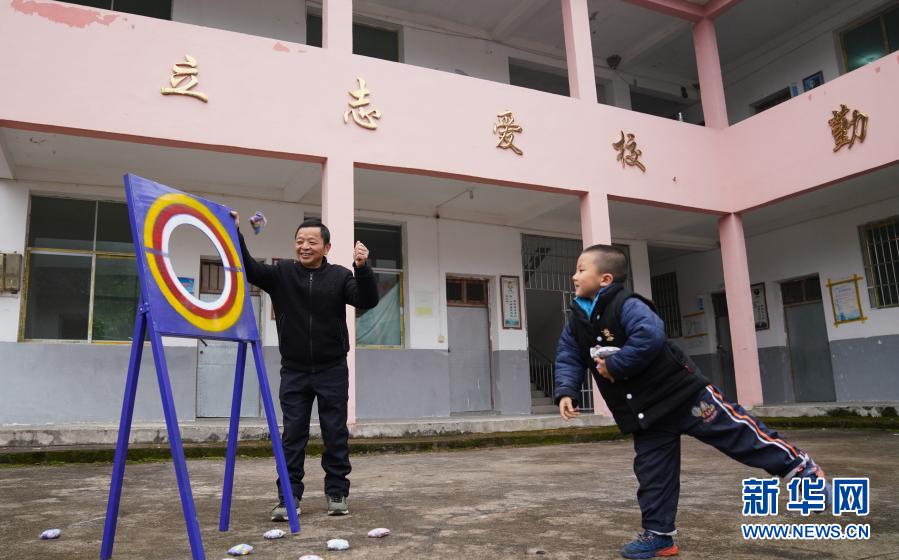 江国南(左)在校园内陪江昊天做游戏(12月3日摄)。新华社记者 胡晨欢 摄