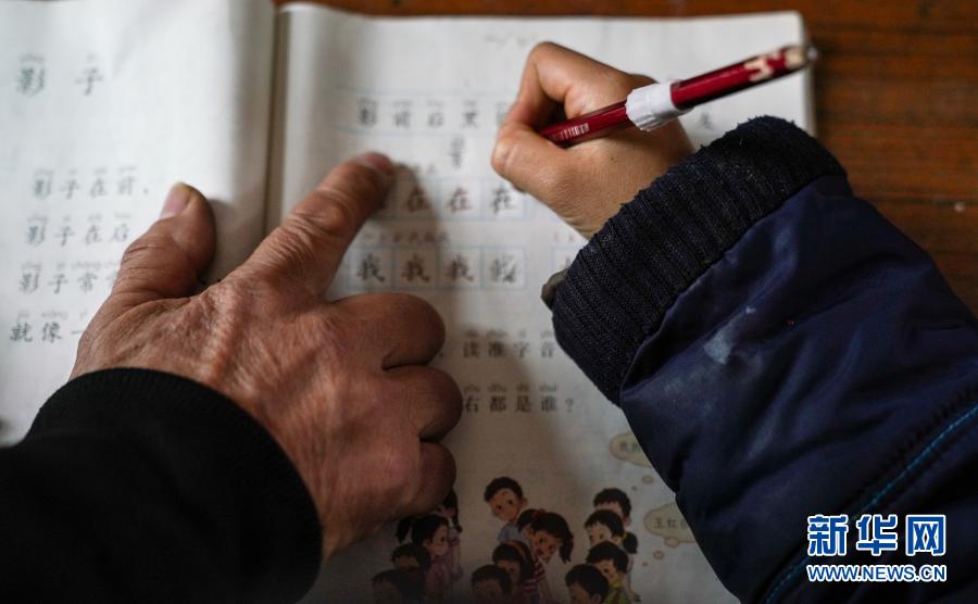 江国南在教室内辅导江昊天功课(12月3日摄)。新华社记者 胡晨欢 摄