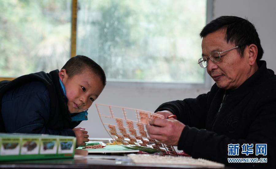 江国南(右)在办公室给江昊天上手工课(12月3日摄)。新华社记者 胡晨欢 摄