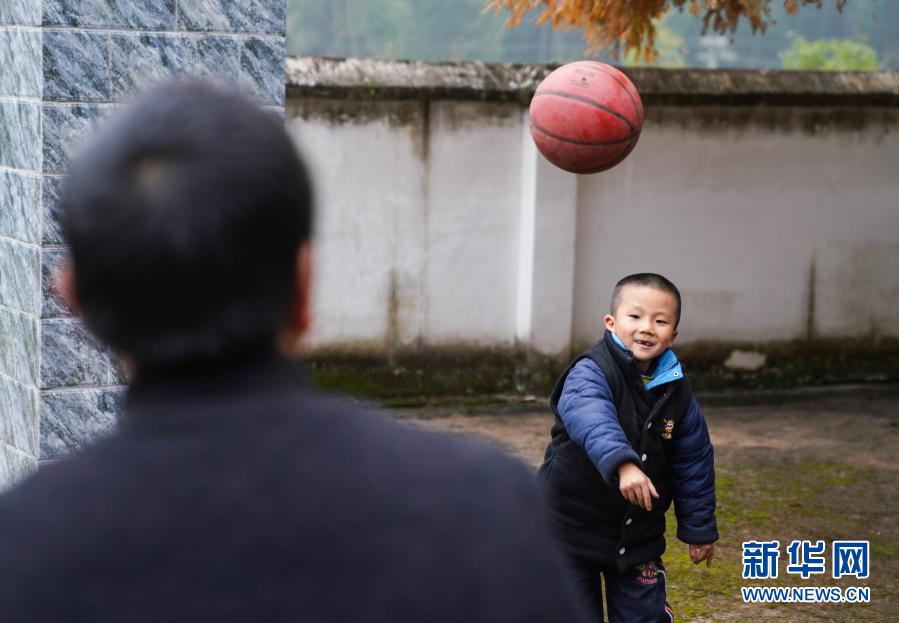 江国南(前)在校园内陪江昊天打球(12月3日摄)。新华社记者 胡晨欢 摄