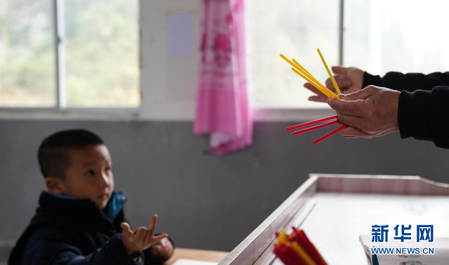 江国南在教室内用教具给江昊天讲解数学运算(12月3日摄)。新华社记者 胡晨欢 摄