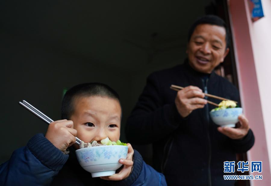 江昊天(左)和江国南在学校吃饭(12月3日摄)。新华社记者 胡晨欢 摄