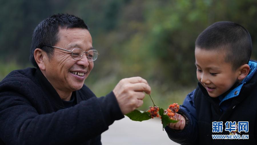 午饭后,江国南(左)在散步途中给江昊天讲解野果知识(12月3日摄)。新华社记者 胡晨欢 摄