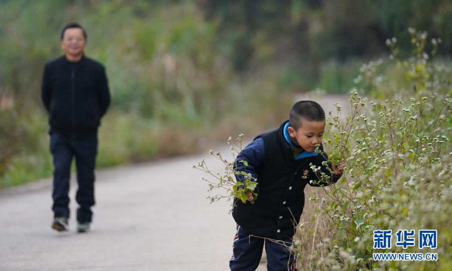 午饭后,江昊天(右)和江国南一起外出散步(12月3日摄)。新华社记者 胡晨欢 摄