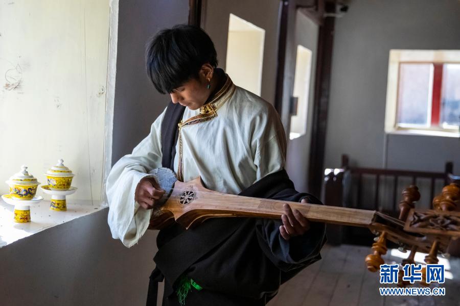 在理塘县勒通古镇的喜马拉雅之声微博物馆,丁真尝试弹奏藏族传统乐器——扎木聂(12月2日摄)。在这个微博物馆,游客可以体验藏族传统乐器,聆听马蹄声等声响,观看藏族传统音乐相关的视频。当地通过老城区改造等一系列措施,打造出著名景区“千户藏寨”,包括勒通古镇、仁康古街、长青春科尔寺等,集中展现理塘的历史文化魅力。这里将成为丁真未来的工作场所之一。新华社记者 沈伯韩 摄