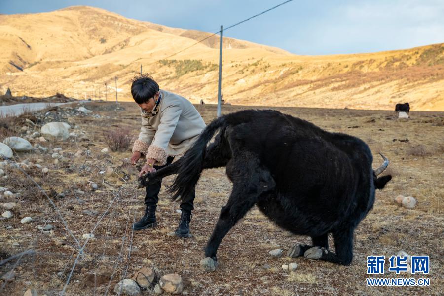 在从小生活的村庄里,丁真解救一只被铁丝网绊住的牦牛(12月2日摄)。新华社记者 沈伯韩 摄