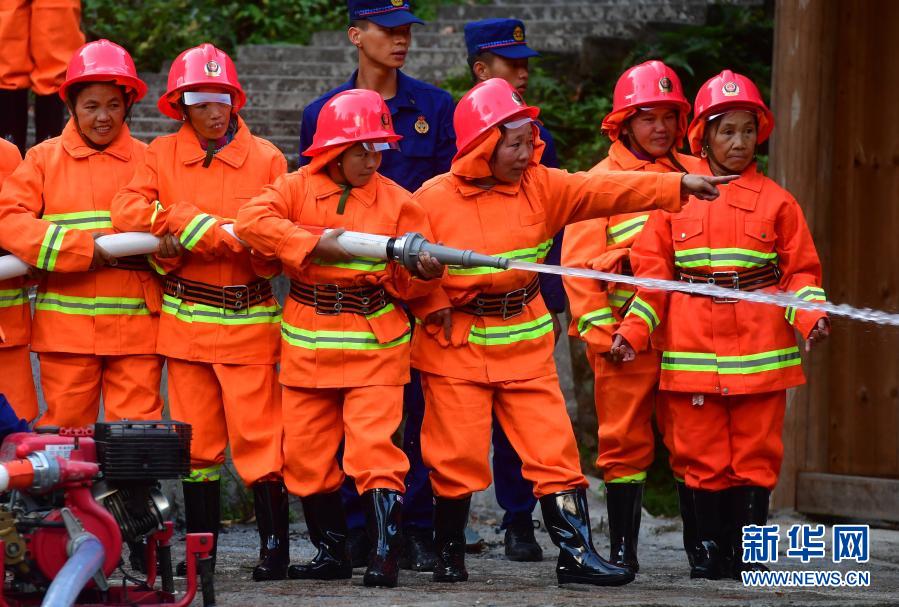 乌英苗寨女子志愿消防队队员梁足英(右三)和队友们在融水县消防救援大队消防队员的指导下进行消防演练(11月19日摄)。新华社记者 黄孝邦 摄