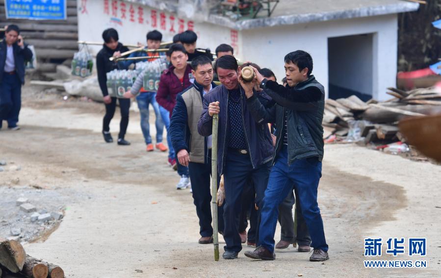 在乌英苗寨,梁秀平(右二)和群众抬贺礼去参加喜宴(2018年2月18日摄)。新华社记者 黄孝邦 摄