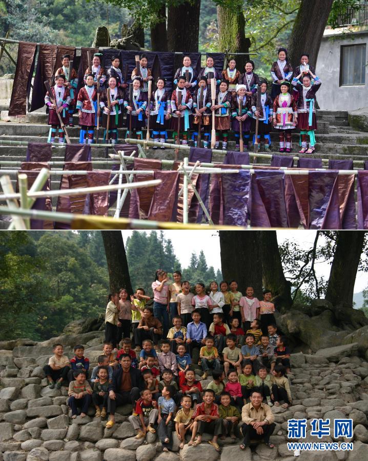 这是一张拼版照片,上图为:2020年10月25日,乌英苗寨“双语双向”培训班的同学们在古树下合影(新华社记者黄孝邦摄);下图为:2006年9月19日,乌英苗寨教学点的师生们在古树下合影(龙涛摄)。新华社发