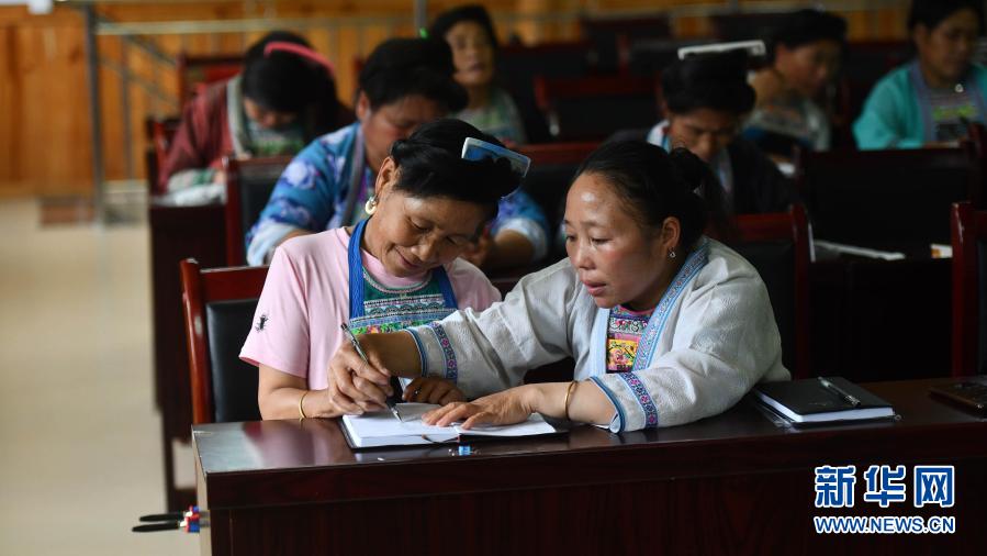 在乌英苗寨“双语双向”培训班课堂上,梁足英(右)和母亲梁英迷在一起学习(6月8日摄)。新华社记者 黄孝邦 摄