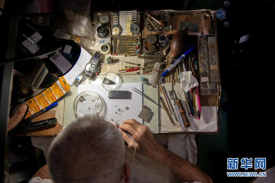 12月5日,在马来西亚雪兰莪州巴生的郁昌表行,韦华在维修手表。新华社发(张纹综摄)