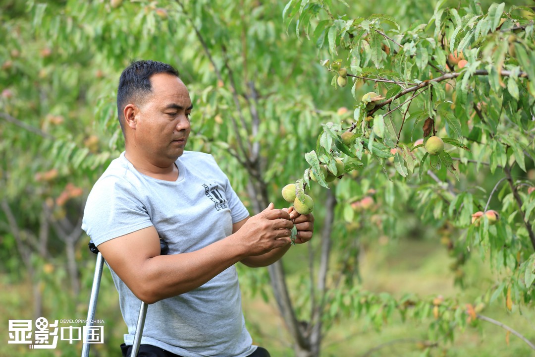 养鸡场步入正轨后,2003年,毕怀中又拄着拐杖、扛着锄头,在另一片山头掘开土地,种植果树。“单一产业风险太大,我种点果树,一旦养鸡场有亏损,卖水果也还能保个底。”图为毕怀中在果园里查看水果长势。新华网 赵普凡摄