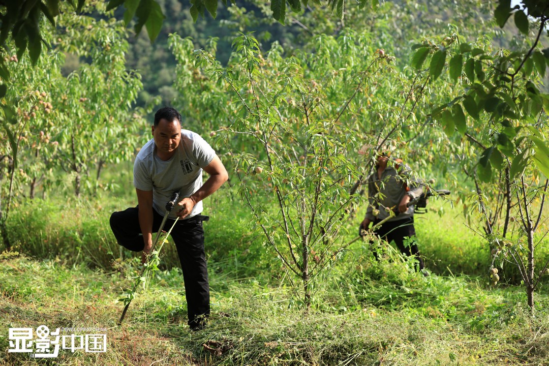 跟养鸡比起来,种植果树的艰辛有过之而无不及。“拄着拐杖挖地,相当吃力!我就跟自己说,慢慢来,每天能挖一点就挖一点,能栽一棵就栽一棵。”用了10年时间,毕怀中建成了30亩果园。图为毕怀中在果园里。新华网 赵普凡摄