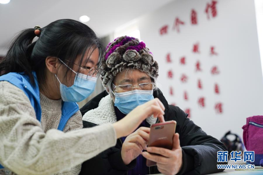 12月8日,在北京市海淀区花园路街道市民活动中心,北京外国语大学的志愿者史佳怡(左)为老人讲解如何使用智能手机查询健康码。
