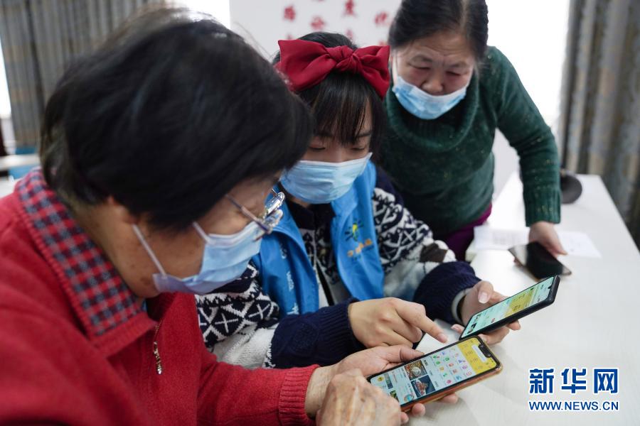 12月8日,在北京市海淀区花园路街道市民活动中心,北京外国语大学的志愿者(中)为老人讲解使用智能手机点外卖。新华社记者 鞠焕宗 摄