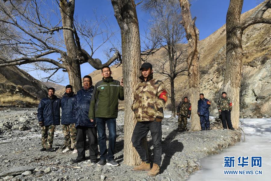 12月8日,祁连山国家公园扎麻什管护站工作人员郝生宝、昂旦才让、索安东周、杨国林、索安拉什旦、昂毛什加、多杰昂秀、周曲才郎在巡护途中合影(从左至右)。新华社记者 张宏祥 摄