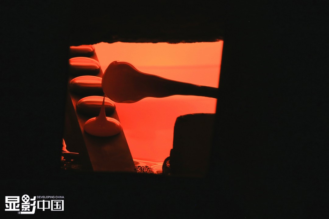 熔炉内的温度达2000℃左右,外围温度也将近40℃。每天面对高温,是张佳林和同事最大的挑战。图为在火红的熔炉内滴制永子(11月20日摄)。新华网 赵普凡摄