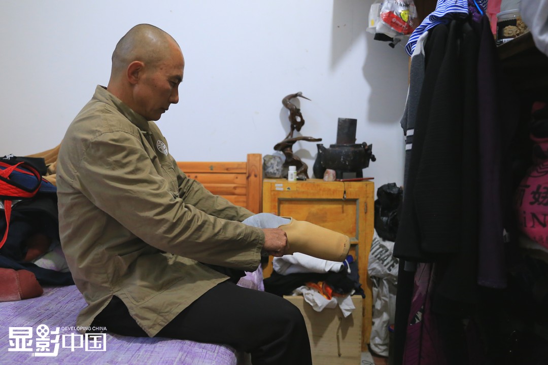 2008年张佳林遭遇车祸,导致左腿患骨髓炎,2011年截肢后,在各级残联的帮助下学会了按摩,并在按摩店工作。图为张佳林穿戴假肢(11月20日摄)。新华网 赵普凡摄
