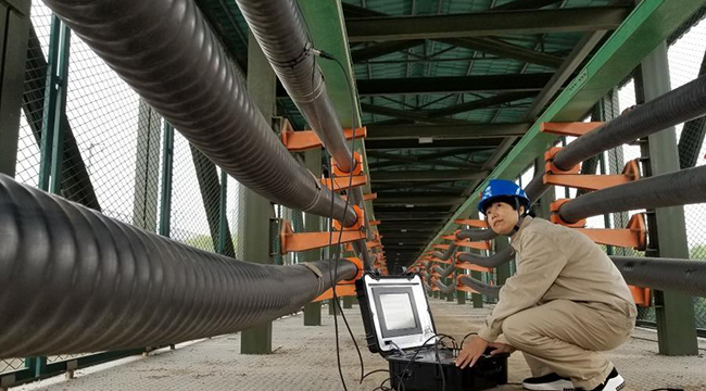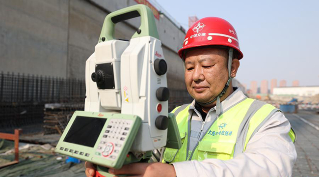 11月30日,在大连湾海底隧道建设工程现场,中交一航局第三工程有限公司测量首席技能专家陈兆海使用三维多波束测深系统进行测量。