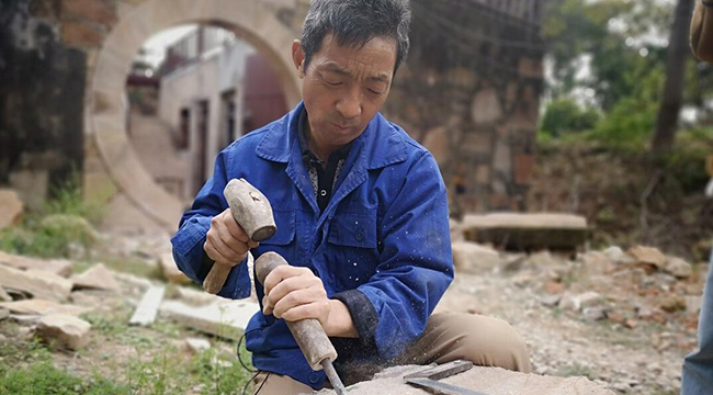 55岁的樊月东是湖北省孝感市孝昌县王店镇磨山村人,在村里做了30多年石匠。磨山石艺是孝感市级非物质文化遗产,樊月东是磨山石艺传承人。图为樊月东将毛料去边角改小。