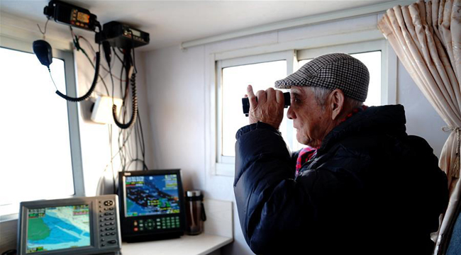 12月3日,陈亚瞿在船上观察长江口深水航道的南导堤。 中国水产科学研究院东海水产研究所退休专家陈亚瞿教授已年过八旬。