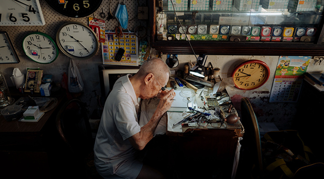 韦华老师傅今年84岁,在马来西亚雪兰莪州巴生的郁昌表行修理钟表。