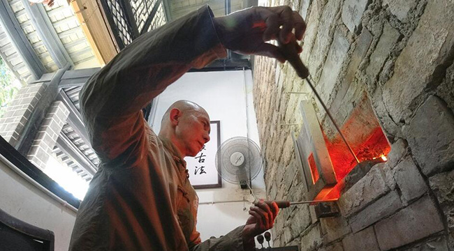 “蘸裹、滴沥、旋转……”在云南省保山市隆阳区金鸡乡育德村的永子文化园内,张佳林正在熔炉前滴制永子,坐着的他很难看出只有一条腿。