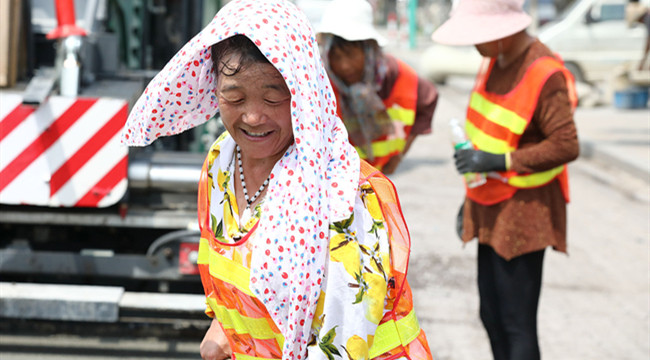 当日,“秋老虎”发威,江苏省连云港市持续高温天气。当地修路工人坚守在施工一线,浇筑沥青、修补路面。