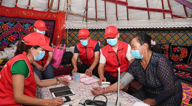 布勒布勒古丽是新疆布尔津县也格孜托别乡的一名家庭医生,为农牧民提供签约服务。每次去为牧民做健康随访,她和同事们都会穿好家庭医生专用的红色制服,戴上红色鸭舌帽,驱车驶入深山,在翠绿无垠的草场上穿梭于一个个毡房之间,格外引人注目。