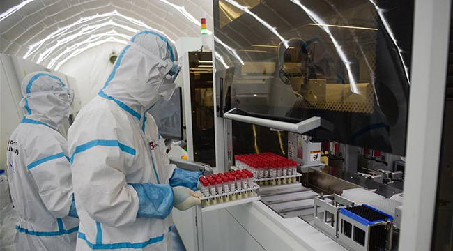 7月1日,在扩增实验室内,实验人员将核酸反应板放入PCR仪中做荧光反应检测。 当日,记者走进北京大兴区体育中心,探访坐落于此的北京首座气膜版“火眼”核酸检测实验室。目前,实验室有16个气膜舱,已累计完成70余万份核酸检测。