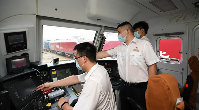 戴着黑色的帽子,穿着蓝色的作业服,在列车检修线路上来回走动,在列车下左右穿插,2020年6月30日早上,重庆车辆段重庆北运用车间33岁的客车检车员周涛如往常一般开始了新一天的工作。