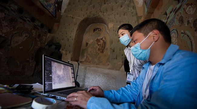 今年35岁的李博说自己是地地道道的“山里”人。2008年大学毕业后,她便来到新疆拜城县的克孜尔石窟,成为新疆龟兹研究院文化研究中心的一名研究员。也是在这里,她收获爱情。爱人贾文佳和她一同“隐居”山中,书写着与克孜尔壁画的不解之缘。扫描工作开始前,李博团队往往要花大量时间商定细节。