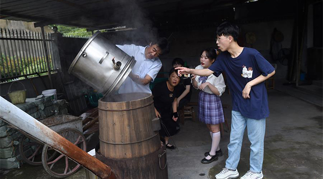 6月24日,创业团队在诸暨市同山镇直播,推销当地农民许国荣家的桃子。假期将至,同学们陆续离校之际,浙江农林大学暨阳学院2018级工商管理专业学生莫子衿带领创业团队来到诸暨市同山镇,将手机变成“新农具”,为当地农产品销售拍摄素材并进行直播带货。