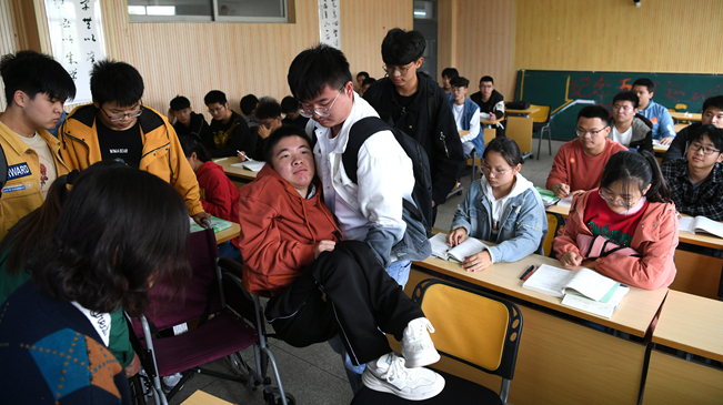 教室总在一楼,座位总是第一排,出门总有同学帮忙,轮椅后总有双温暖的手——从小学到高中,程东东身边始终有一群同学守护着他,传递着爱的“接力棒”。