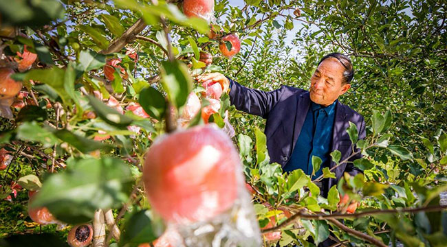 深秋时节,徜徉在河东大地,丰收的田野里到处都是压弯了枝头、红彤彤的苹果。图为运城临猗县北辛乡卓逸村党支部书记、“王万保”果品种植专业合作社负责人王万保(63岁)查看苹果长势。