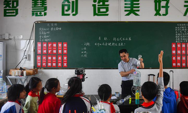 今年58岁的李学战是江西省芦溪县宣风镇中心学校的科技课老师,每当他拖着一个大行李箱出现,总会引来许多学生的欢呼与追逐。