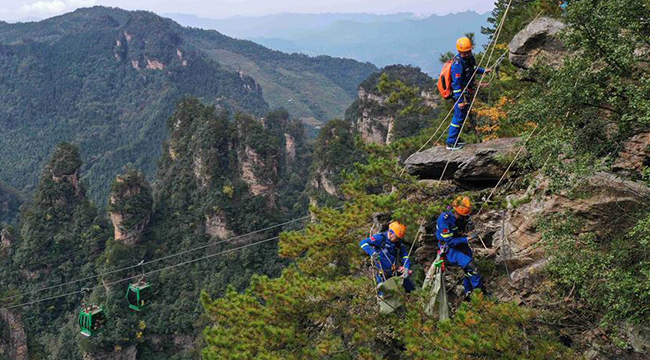 10月21日,在湖南张家界国家森林公园黄石寨景区,张家界市蓝天救援队队员索降到绝壁间捡拾游客丢弃的垃圾。