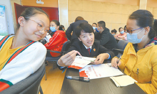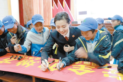10月17日至18日,山东省聊城市外国语学校的440名初一新生,走进山东省检察院青少年法治教育聊城基地参观学习。图为小源告诉检察官自己打算在梦想留言簿上写下“白衣天使梦”。