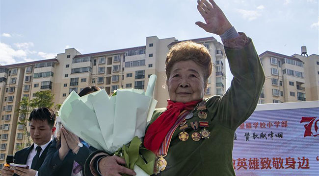 90岁的抗美援朝老战士杨秀珍来到位于昆明市官渡区的云大附中星耀学校小学部,与师生们一同参加纪念中国人民志愿军抗美援朝出国作战70周年主题活动,为学生们讲述抗美援朝时的经历,鼓励同学们从小树立正确的人生观和爱国主义情怀,努力学习报效祖国。