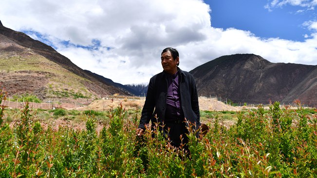 在西藏昌都市芒康县纳西民族乡三江农民专业合作社,扎西旺堆在苗圃里查看石榴树苗的生长情况。