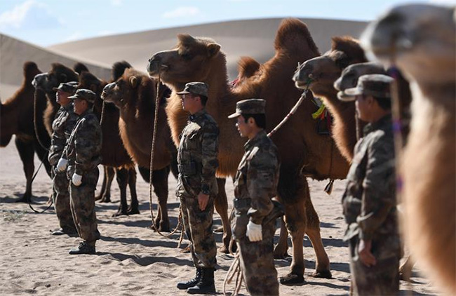 10月15日,阿拉善右旗边防民兵驼兵排民兵、阿拉善边境管理支队民警和当地牧民进行骆驼应用训练。
