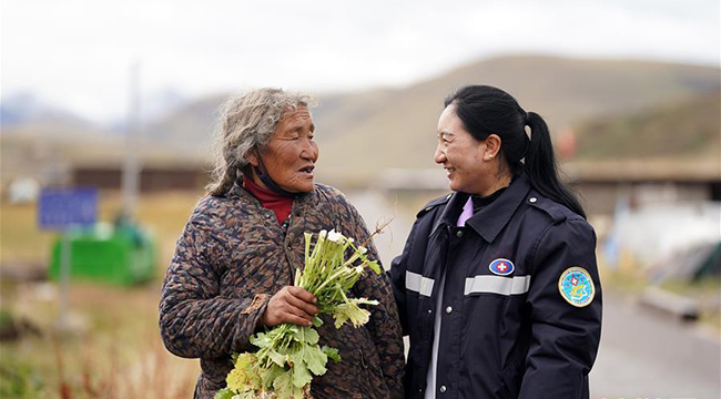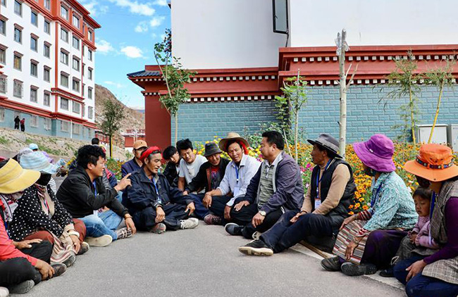 10月7日,在西藏八宿县乃然安置点,赤列旺堆(右四)和搬迁群众聊天,了解大家生活中的困难和意见建议。
