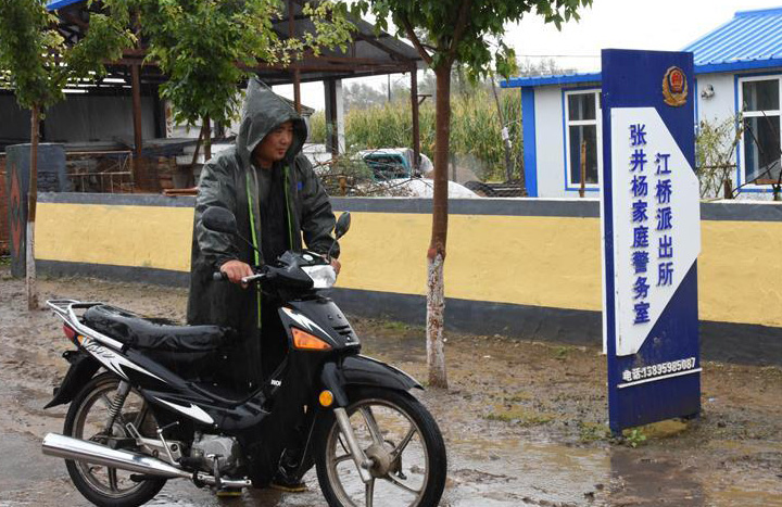 早上5时许,黑龙江省泰来县江桥镇先进村张井杨家庭警务室的红蓝警灯闪烁,“村警”张井杨骑着摩托车开始巡查村里的560户人家。