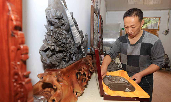 2020年9月21日,湖南张家界市桑植县化石石雕生产性保护示范基地,雕刻技师在加工制作化石石雕。在湖南省张家界市桑植县,化石石雕于2017年被列入市级非物质文化遗产名录。