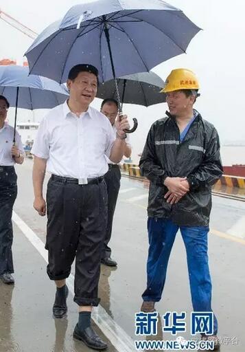 2013年7月21日12点38分,新华网发布的一张照片感动了网友,照片上是习近平打着雨伞考察的画面。这天上午,习近平来到武汉新港考察,没有鲜花,没挂欢迎横幅。11点50分,大雨滂沱,习近平卷起裤腿,打着雨伞,冒雨考察,由于雨太大,身上的衬衣全都淋湿了。